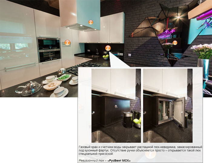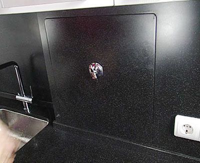 Кухонный фартук из искусственного камня перекрыл доступ к счетчикам воды и газовому крану. Чтобы не переносить коммуникации и обеспечить доступ к приборам, в фартуке оборудовали небольшой замаскированный люк. Его распашная дверца оснащена регулируемыми петлями, а также пыле- и влагоуплотнителем. Собирается такой люк без сварки, а открывается с помощью ручки-присоски.